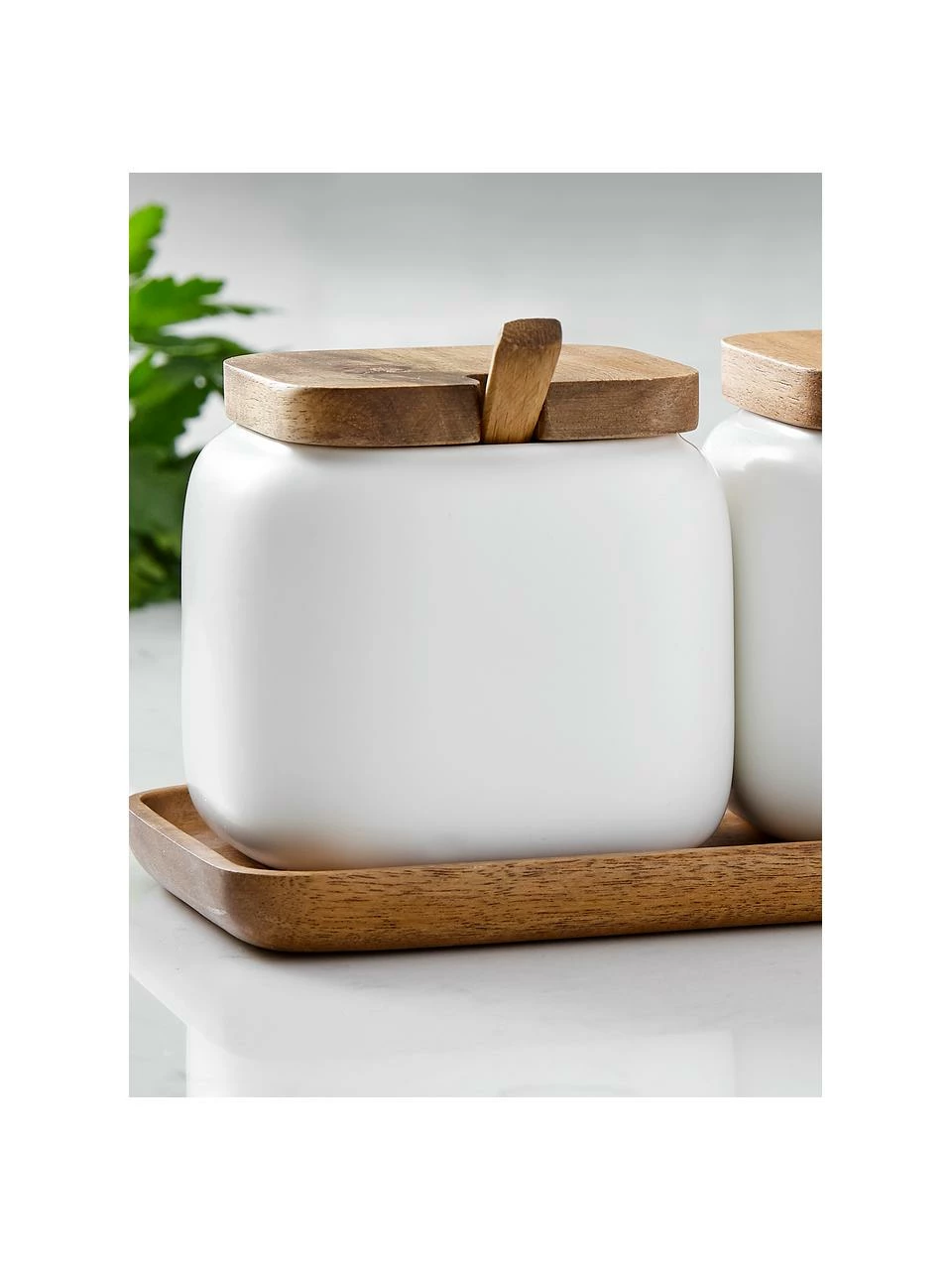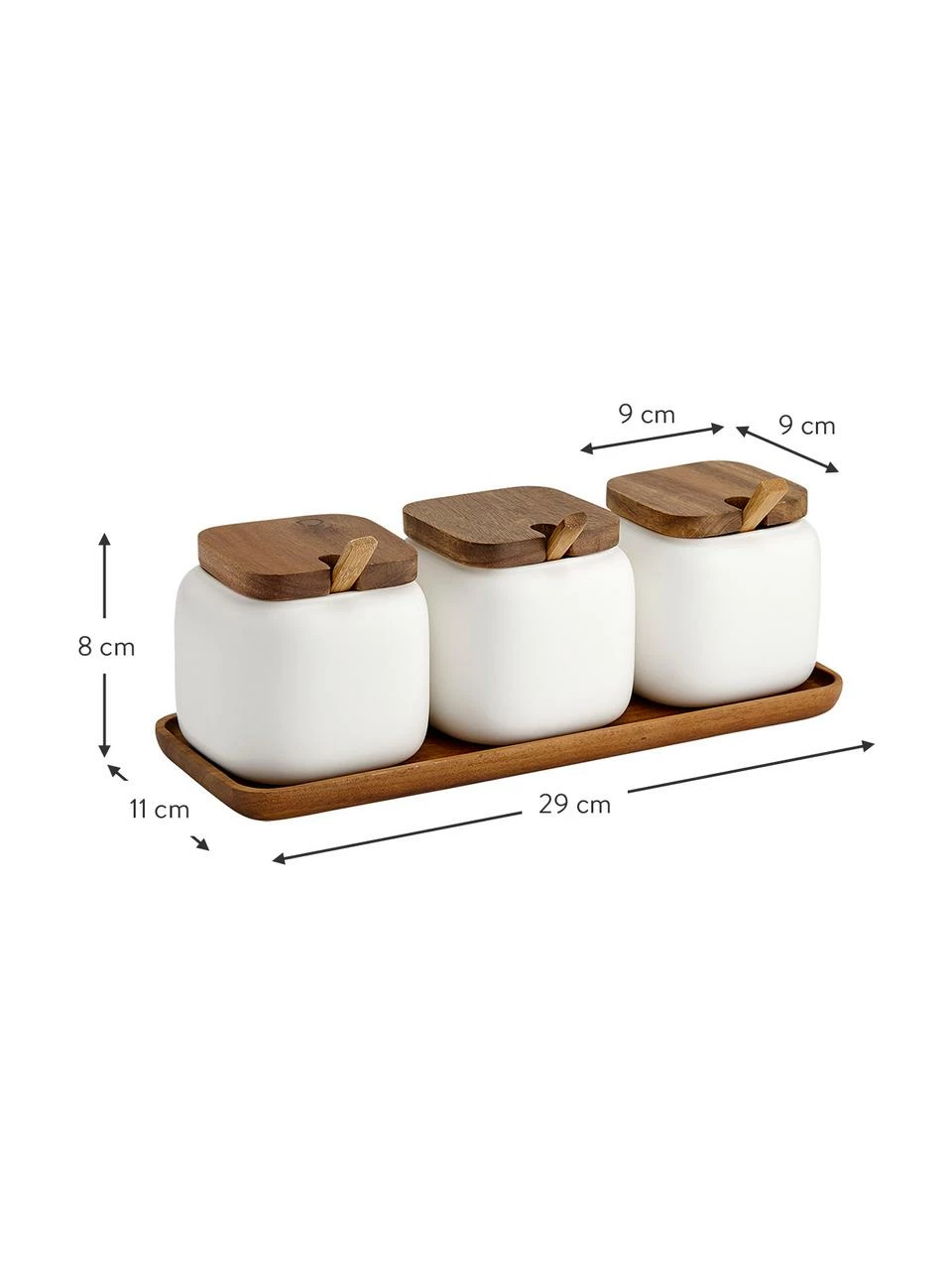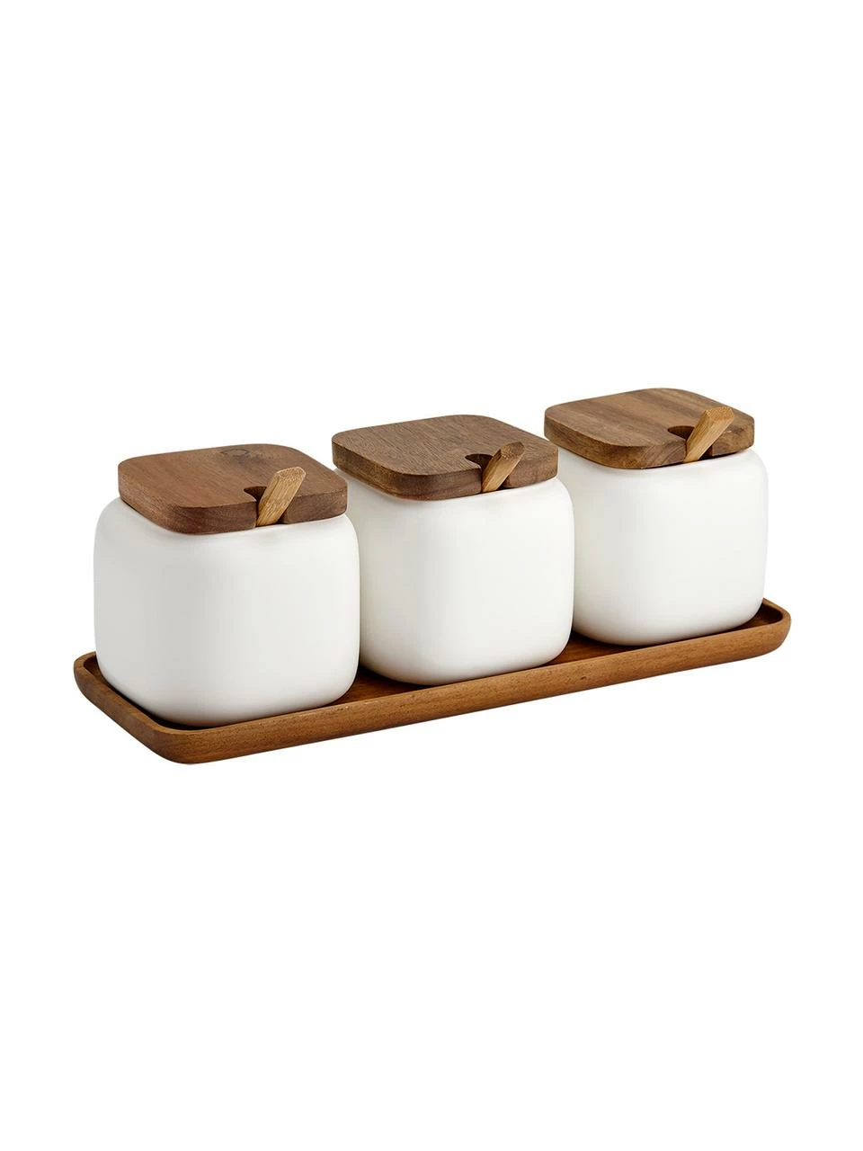 Ensemble à 7 éléments, composé de 3 boîtes de rangement chacune avec un couvercle et une cuillère et 1 plateau en bois