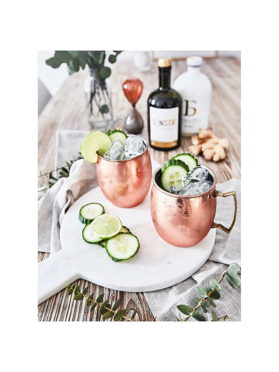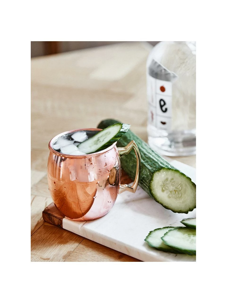 Remplissez de bière au gingembre et garnissez le cocktail d’un brin de menthe et des tranches de concombre restantes, selon vos souhaits