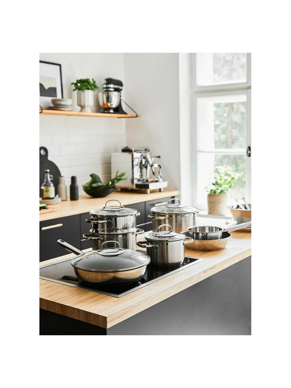 Fond encapsulé en acier inoxydable avec noyau en aluminium : emmagasine idéalement la chaleur et garantit une répartition rapide et homogène de la chaleur
