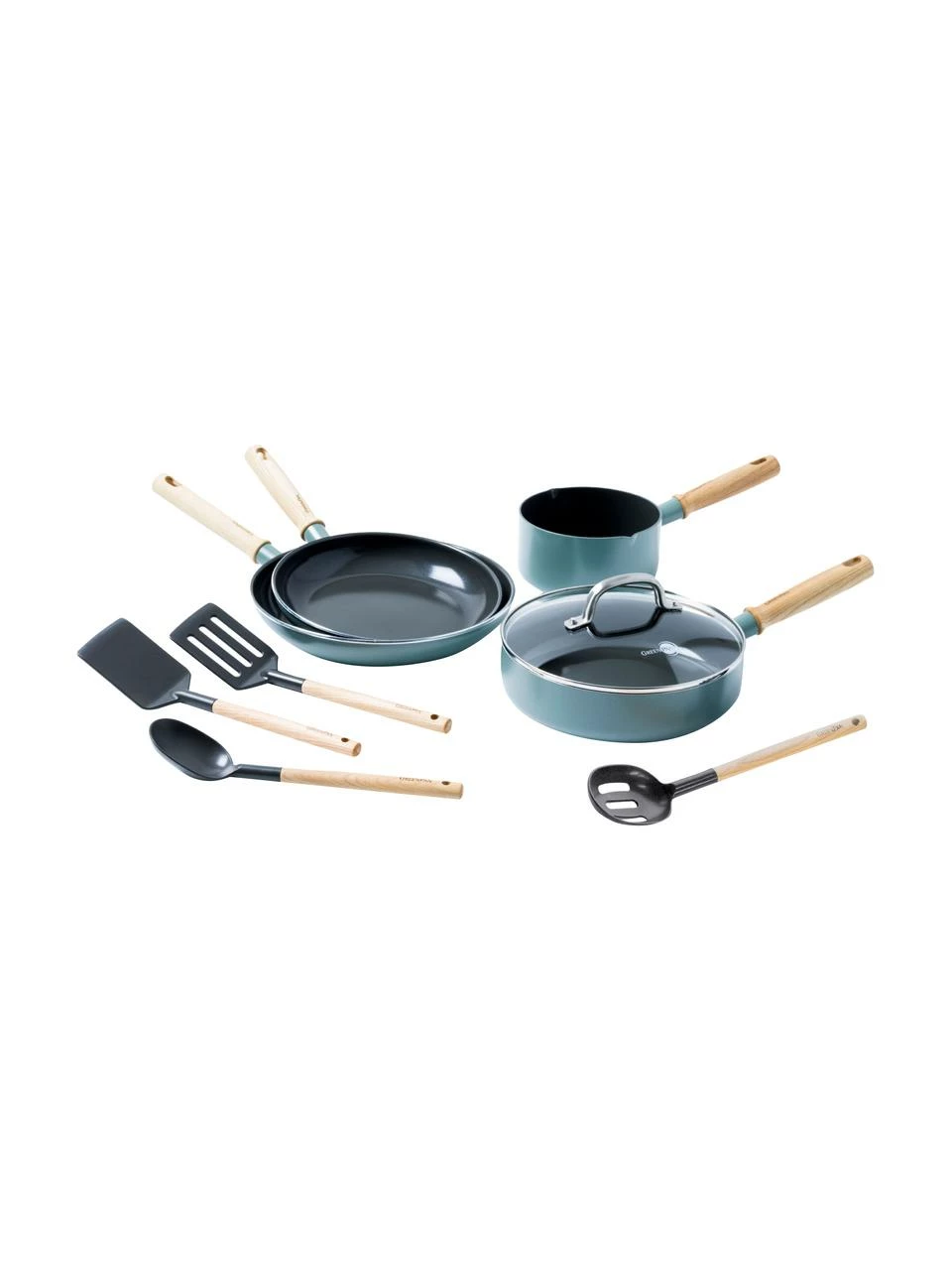 – Set de cuisine de 8 pièces comprenant 2 poêles, 1 casserole, 1 marmite avec couvercle et 4 ustensiles de cuisine